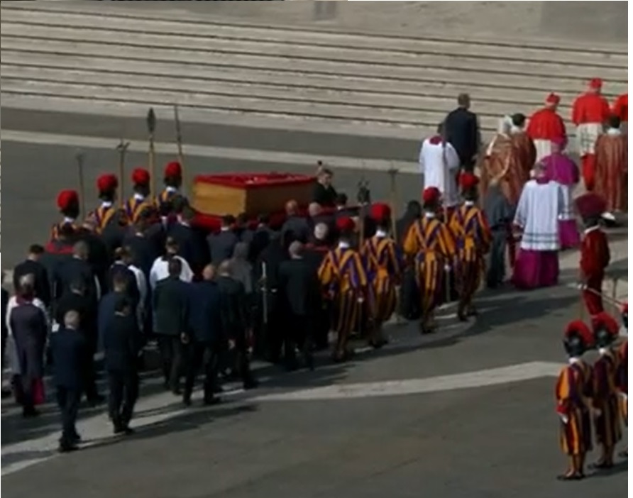 Rispettando le volontà del Papa, la bara è stata deposta davanti all'Altare della Confessione su una piccola pedana leggermente inclinata, posta su un tappeto a terra, senza l'uso del tradizionale catafalco. La bara, portata da 12 sediari, è rimasta aperta durante la processione in piazza San Pietro, dove un lungo applauso ha accolto il feretro.